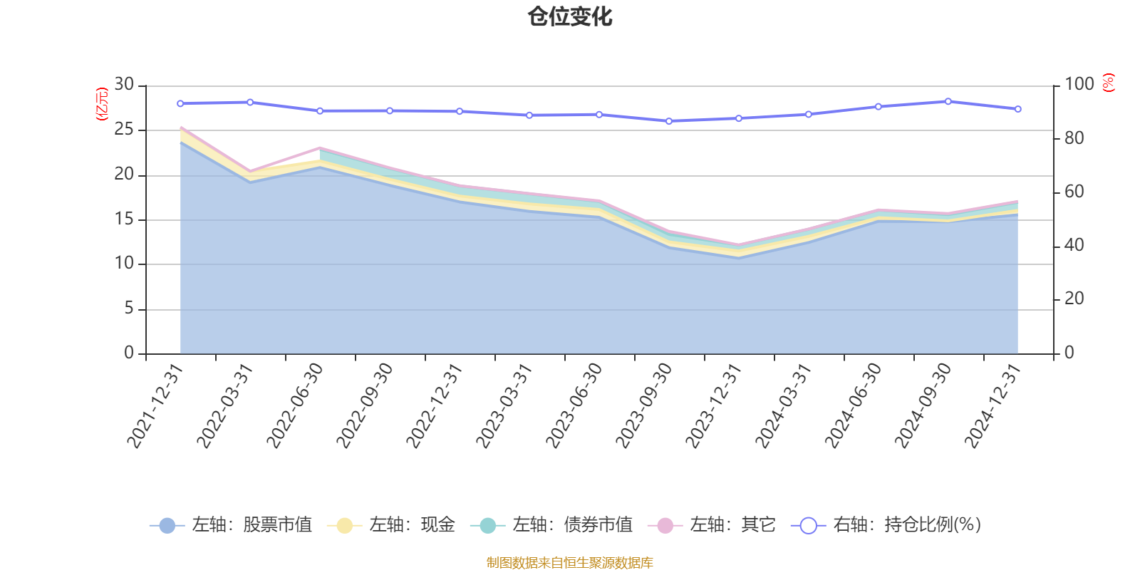 据定期报告数据统计,近三年平均股票仓位为90.37%,同类平均为87.17%。2024年三季度末基金达到94.09%的最高仓位,2023年三季度末最低,为86.7%。